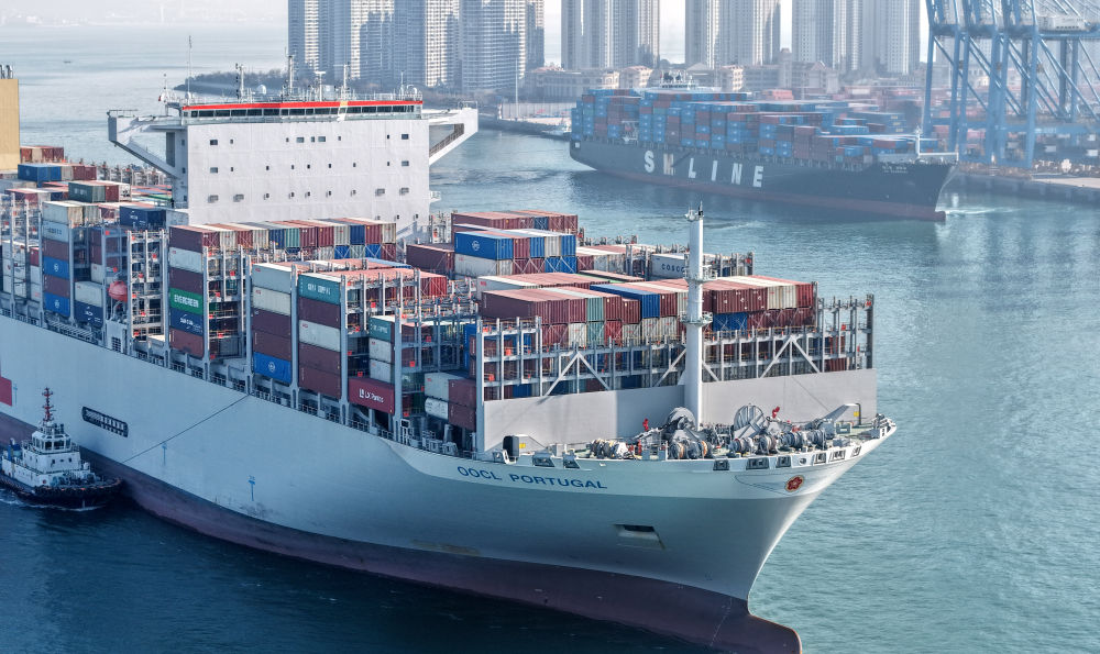 2025年12月4日,貨輪進出山東港口青島港前灣港區(qū)(無人機照片)。新華社記者 李紫恒 攝